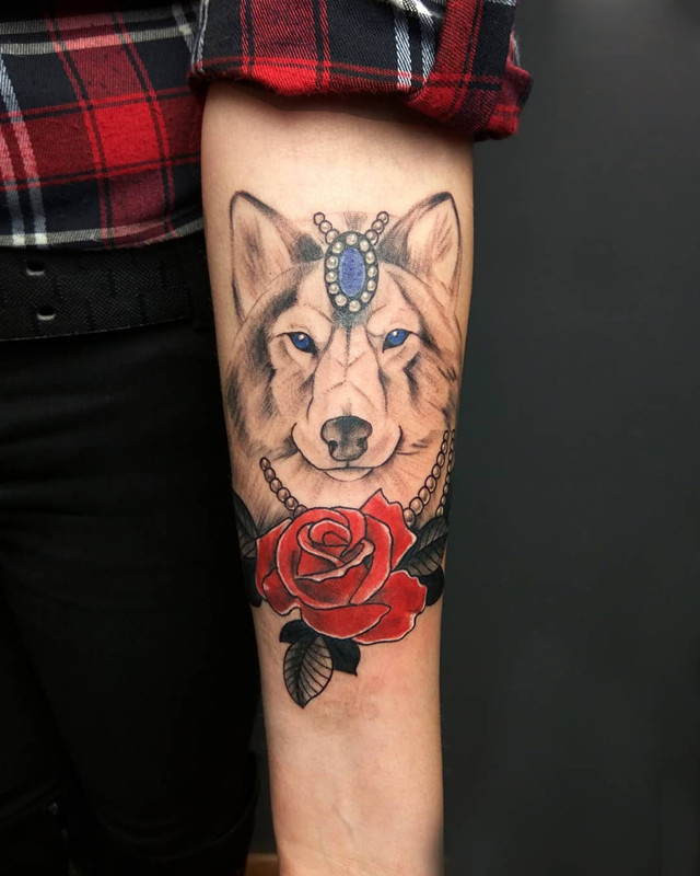 某美甲店老板景先生小臂玫瑰狼纹身图案